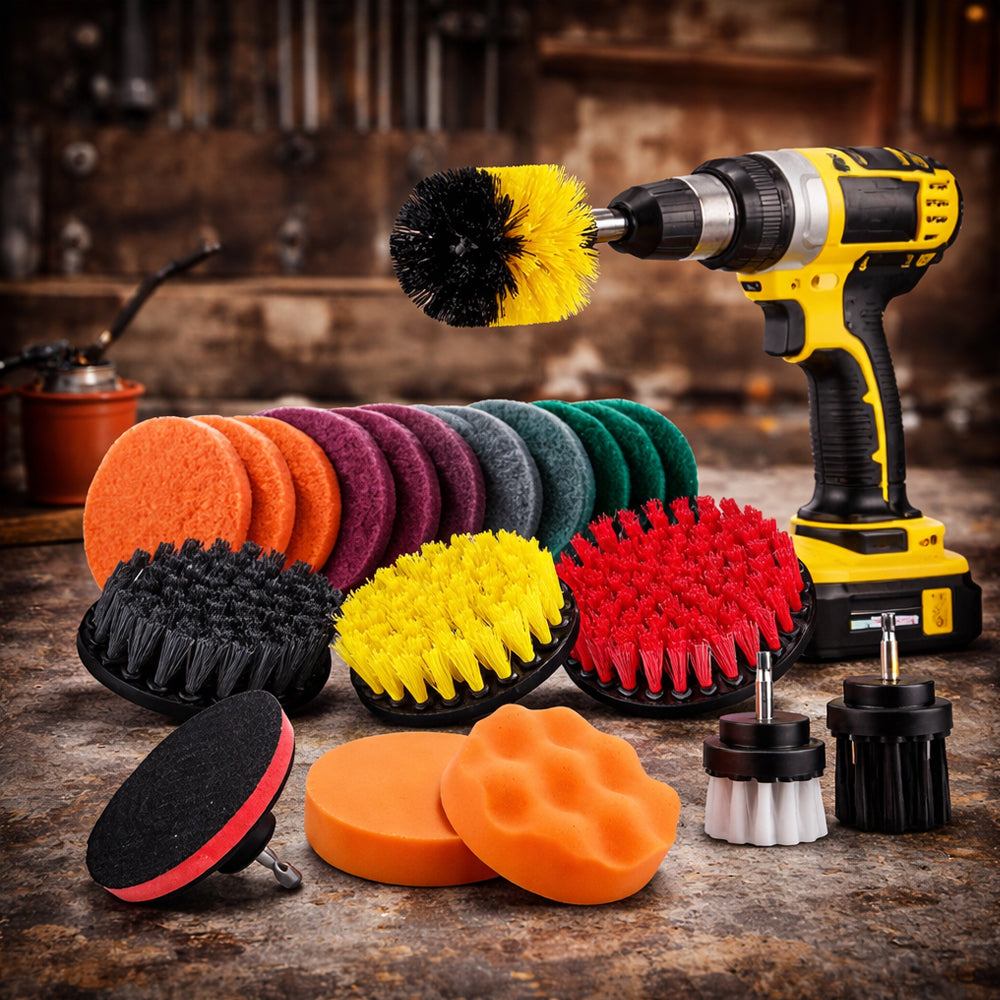 22-i-1 sættet indeholder både slidstærke nylonbørster med medium stivhed samt rengørings- og slibepuder, som gør det muligt at håndtere alt fra daglig rengøring til mere genstridigt snavs og overfladebehandling – uden at beskadige materialerne.