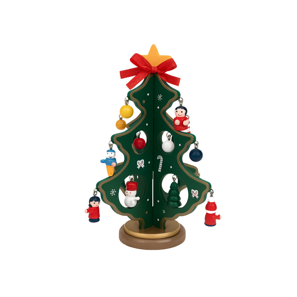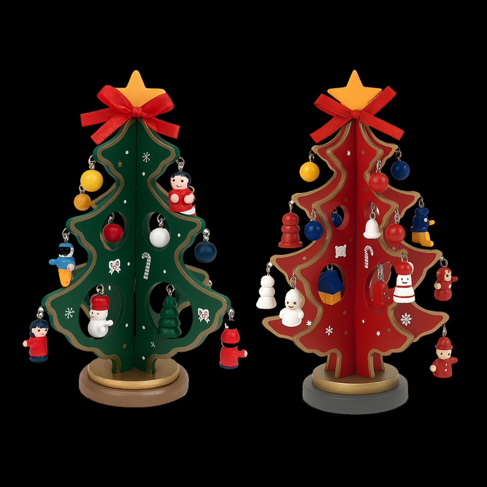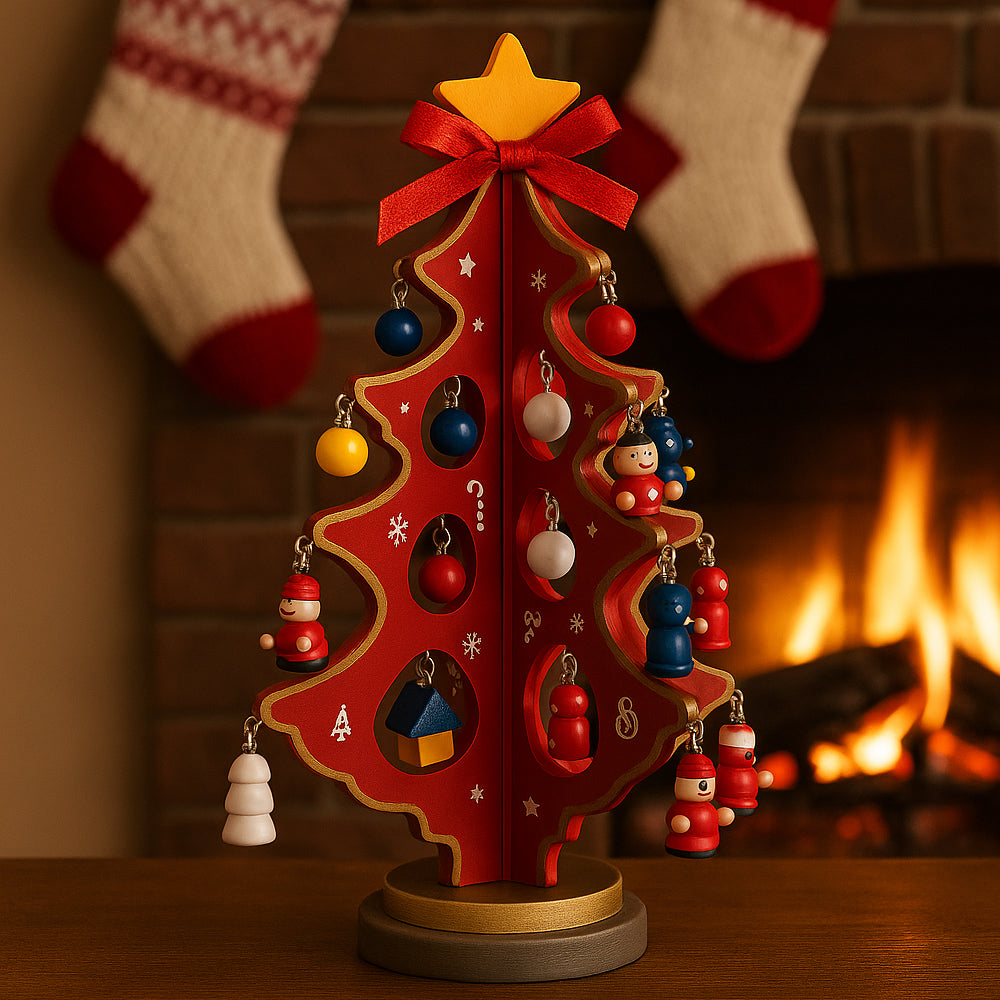 Træet er udformet i klassisk jule-design med rød topstjerne og sløjfe samt små detaljerede illustrationer, der fuldender det varme og hyggelige look. Den kompakte størrelse gør det perfekt til vindueskarm, reol, skrivebord, entre eller som en sød dekoration på julebordet.