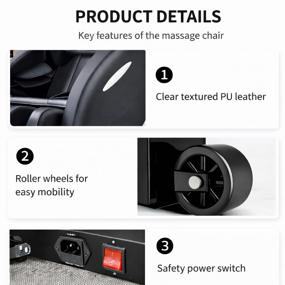 Massagestol A5 er udstyret med airbags, der målretter skuldre, arme, hofter, ben og fødder for komprimerende komfort og bedre cirkulation.